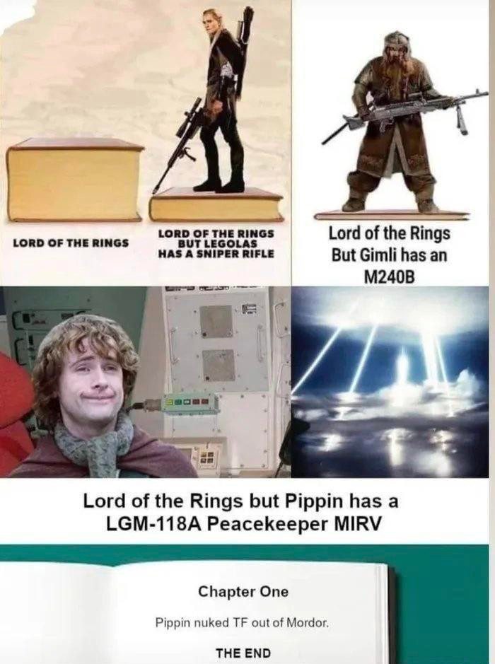 minus-squareIninewcrow@piefed.calinkfedilinkEnglisharrow-up4·9 hours agoLOTR but the fellowship have access to a Blackhawk helicopter