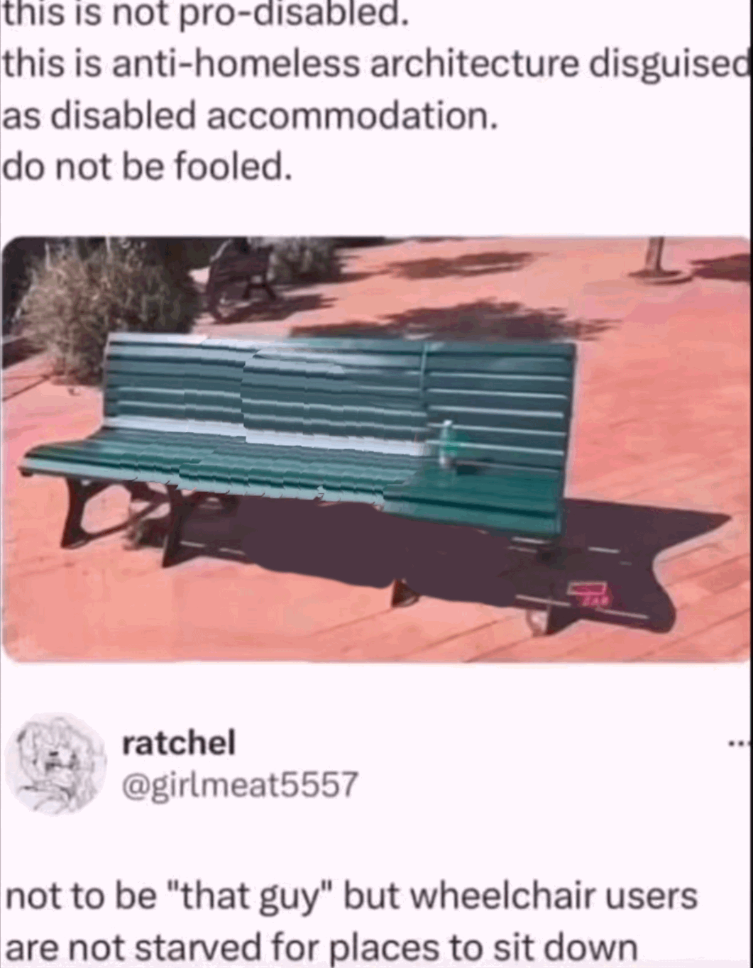 But what if it’s more nefarious than that? No budget to put in new benches with spikes or whatever built in. But maybe there’s room in the budget for “accessibility upgrades”. Maybe a ramp was sacrificed for this idiocy.